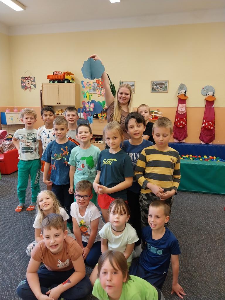 Se slečnou praktikantkou jsme si vyrobily krásnou letní dekoraci- motýlkový závěs a naučili písničku o vývoji hmyzu.